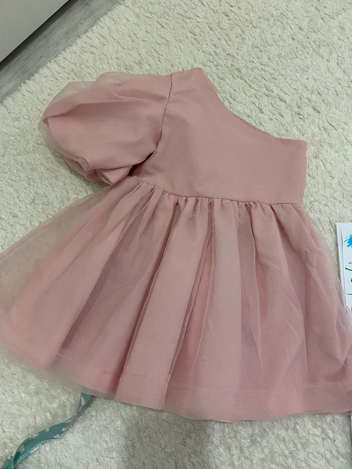 Pembe tonlarda, uzun kollu, tek renk, fırfır detaylı, salaş kesim kız elbisesi. Yumuşak sentetik kumaştan, normcore tarzında.