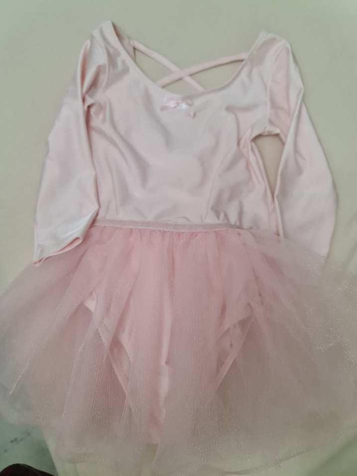 Uzun kollu, V yaka ve pastel pembe renkte, fırfırlı detaylı, katmanlı yumuşak kumaşlı kız elbisesi bale kostüm
