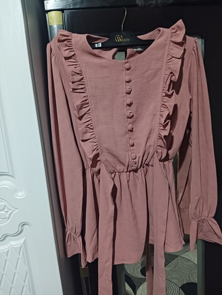 Pastel pembe, uzun kollu, fırfırlı detaylara sahip salaş kesim bluz. Yumuşak sentetik kumaştan,