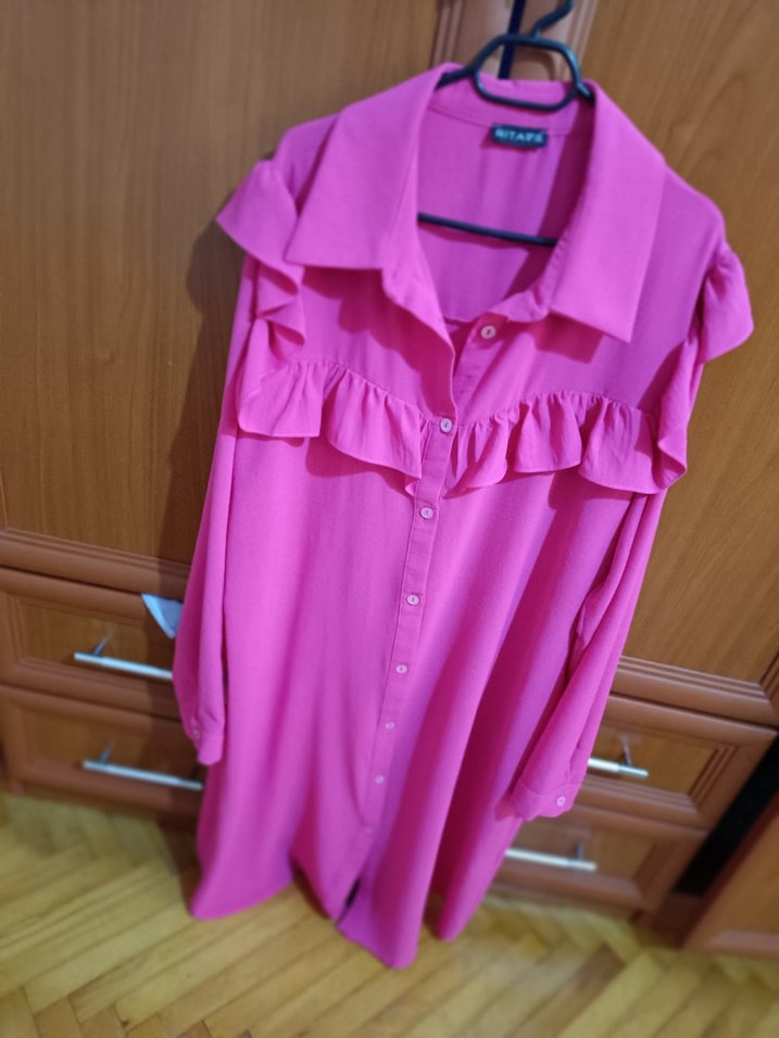 Bol kesim, uzun kollu, yakalı ve fırfırlı detaylı tunik. Yumuşak sentetik kumaştan, pastel pembe renkte, günlük rahat sokak stili için uygun.