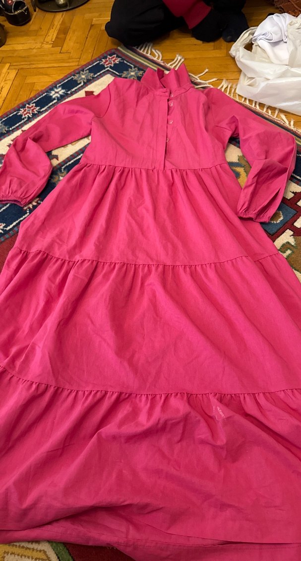 Pembe renkli, keten kumaştan, bol kesim uzun elbise. Fırfır detaylı, uzun kollu ve yüksek yakalı, bohem tarzda günlük kullanım için uygun.