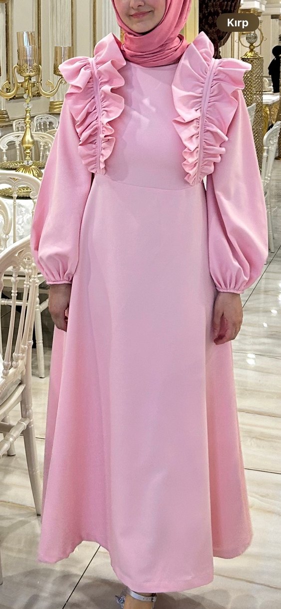 Pembe Uzun Kollu Fırfırlı Uzun Elbise