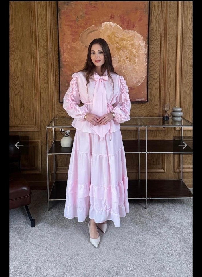 Pembe renkte, fırfırlı detaylı uzun kollu ve uzun boy elbise. İpek gibi kumaştan, bağlama yakalı ve bağlama desenlidir. Romantik akşamlar için uygundur.