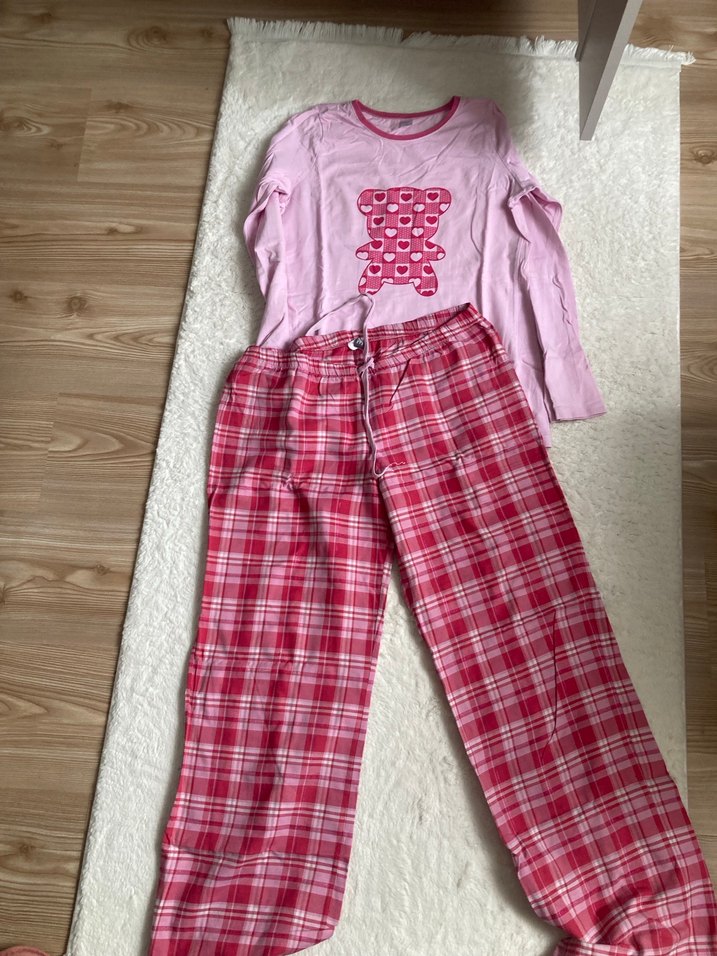 Kadınlar için gevşek kesim, uzun kollu pembe üstü kalp desenli ayıcık ve kırmızı ekoseli pantolonlu pijama takımı. Rahat ve sokak stili uyumu sağlar.