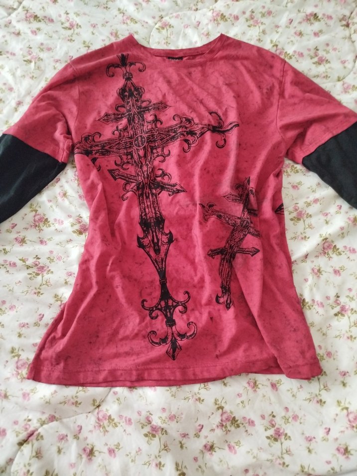Bu bol kesim kız çocuk tişörtü, uzun kollu ve yuvarlak yaka olup yumuşak sentetik kumaştan yapılmıştır. Koyu pembe zemin üzerinde siyah gotik haç baskıları ve dantel detayları vardır, bohem ve retro tarzına uygundur. ✨