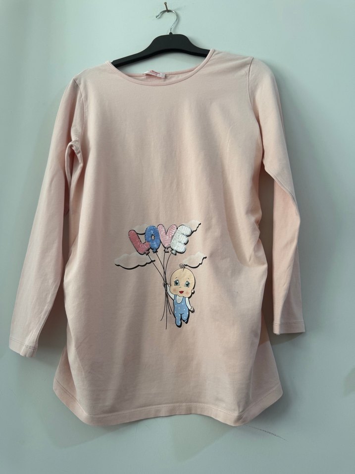 Pamuklu, örgü dokulu, uzun kollu, yuvarlak yakalı, bol kesim pembe hamile tişörtü, sevimli baskılı desenli.