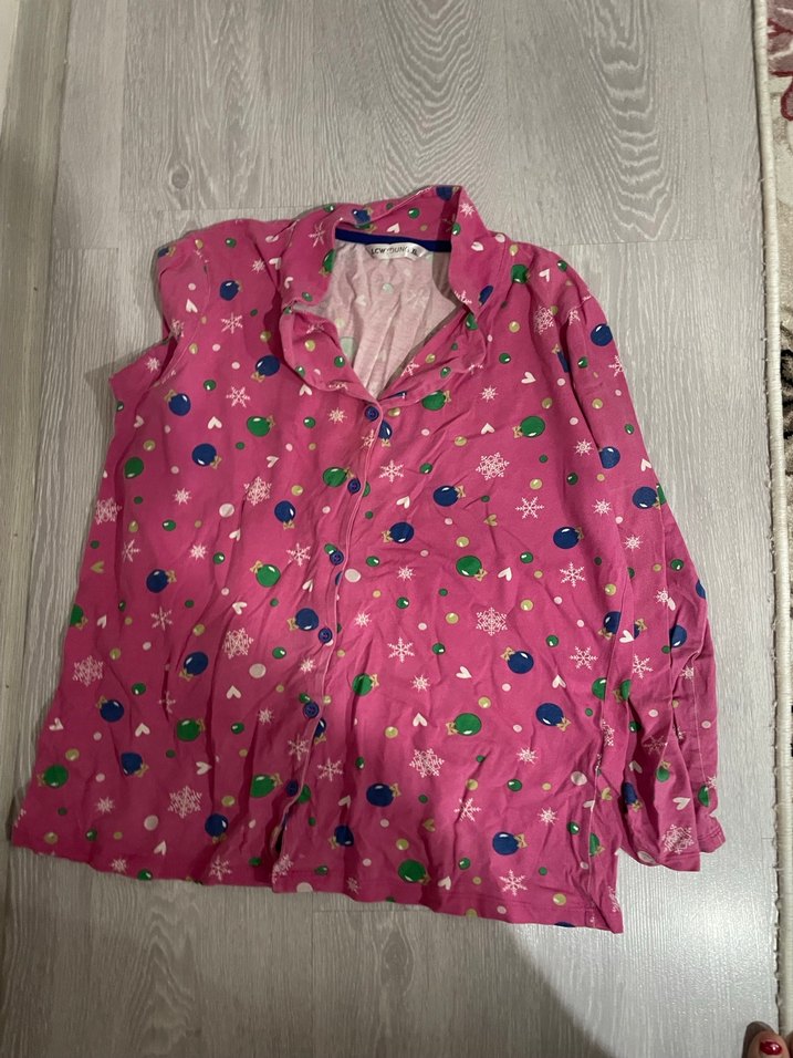 Renkli pembe kumaş üzerine desenli, uzun kollu, yakalı, bol kesim hamile ve emzirme pijama üstü.