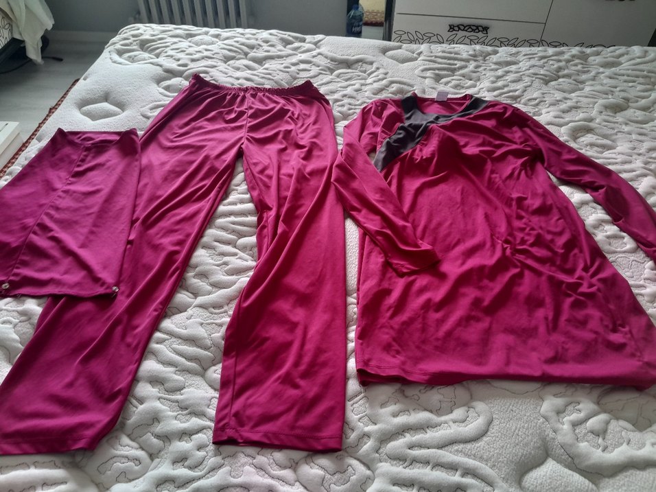 Uzun kollu, yuvarlak yakalı, pembe haşema ve midi boy pantolon ile rahat kullanım sağlar.