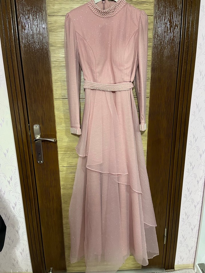 Pembe uzun kollu abiye elbise, yüksek yakalı ve drapeli katmanlara sahip. Yakada, manşetlerde ve kemerde inci detayları bulunur. Düğünler için uygundur.Ürünün yanında ürün ile aynı renkte şalı vardır.