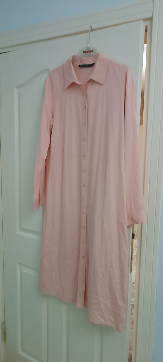 Pembe pastel renkte, uzun kollu keten kumaştan yapılmış, düğmeli ve yakalı uzun kesim, bol kesim kadın tunik. Minimalist ve normcore stil sunar, günlük kullanım için uygundur. not kumaşı ipek keten