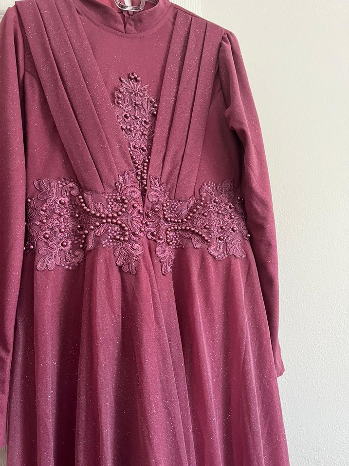 Bordo, yüksek yakalı ve uzun kollu, drapeli detaylar ve zarif işlemelerle süslenmiş, vücuda oturan uzun abiye elbisedir. ✨