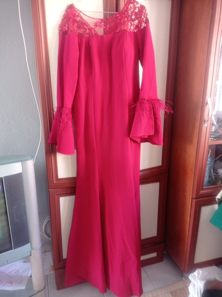 Pembe uzun kollu abiye elbise, tekne yaka, işlemeli ve volanlı kollar ile drapeli detaylara sahiptir. Düz kesim ve modern klasik şıklık sunar, düğün için uygundur. Etiketli ürün Kaçırmayınnn Bedenleri mevcut Yeşil renk seceneği de var