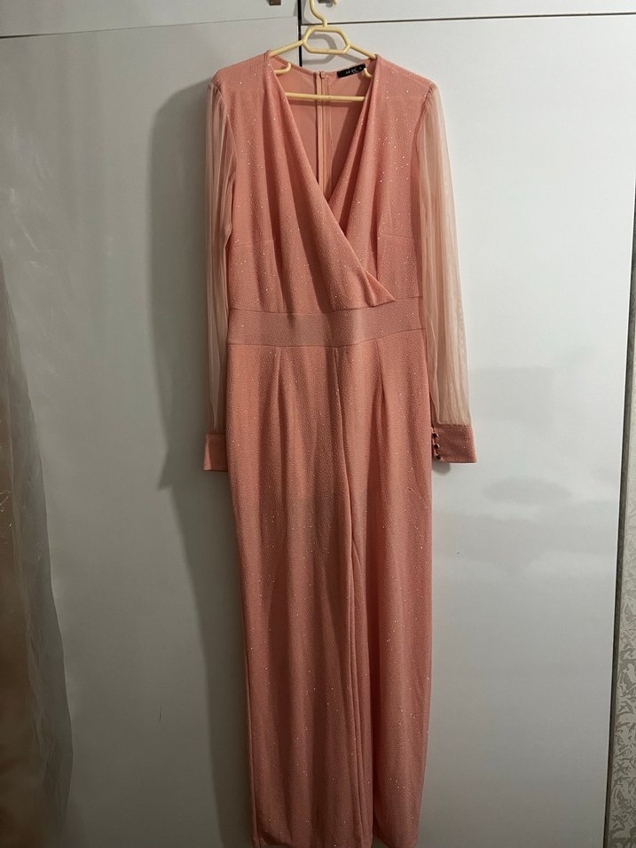 Pembe Uzun Kollu Kadın Abiye Tulum
