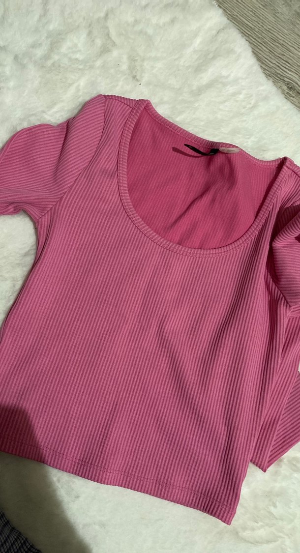 Pembe tonlarında, uzun kollu ve tek renk, rahat sentetik kumaştan yapılmış, vücuda oturan crop body