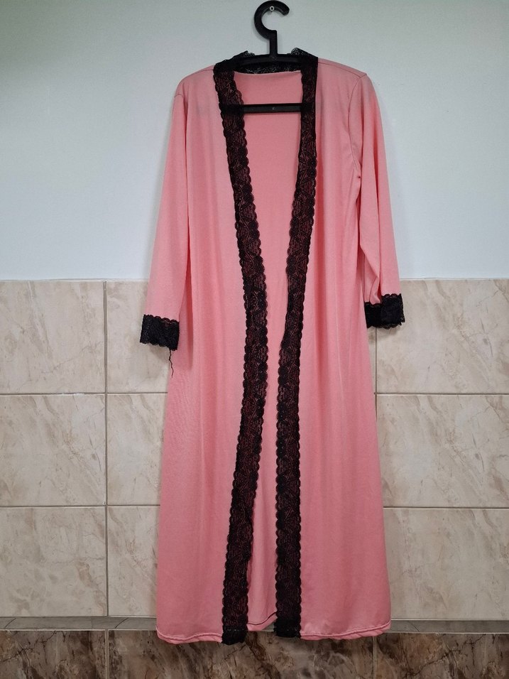 Uzun kollu, bol kesim pembe kadın bornoz, siyah dantel detaylı. Pastel tonlarda, rahat ve klasik tarzda. standart beden 40 bedene uyumludur arka omuz kısmında deformesi var görselde belirtilmiştir