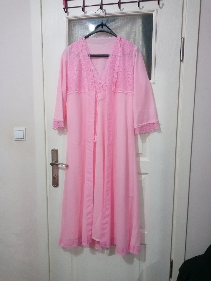 Pembe Uzun Kollu Kadın Gecelik,sabahlık ikili Takım yeni vintega