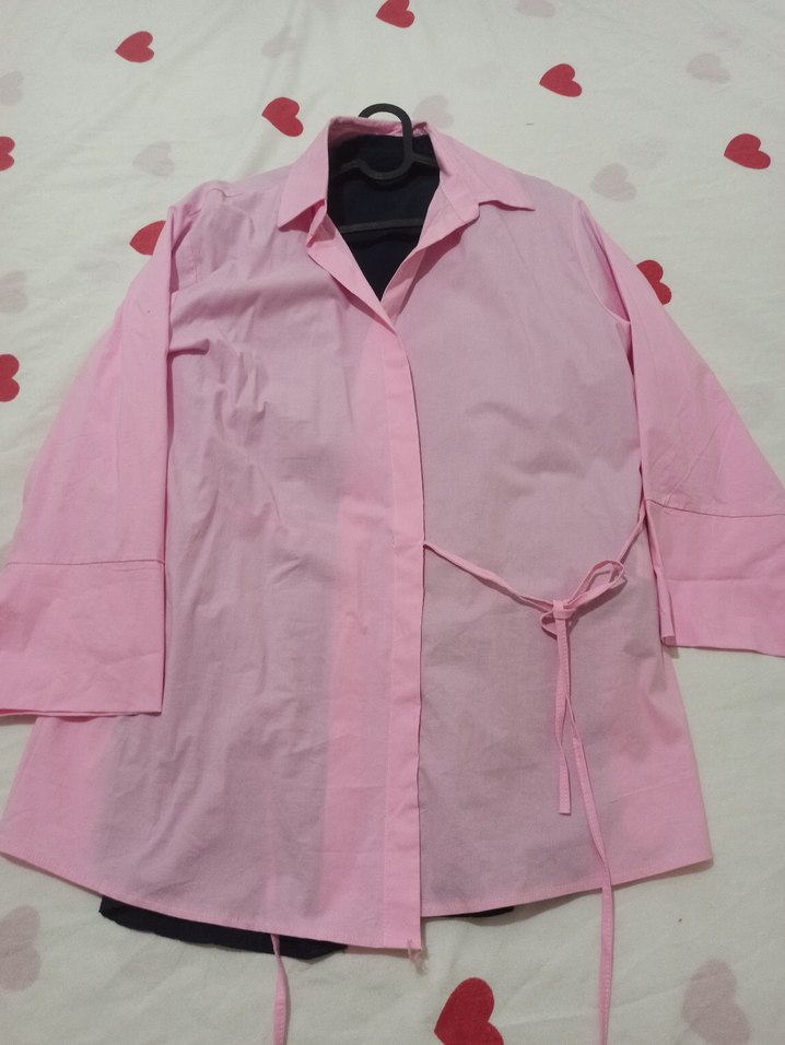 Pembe renkli kadın gömlek, uzun kollu ve yakasında çıtçıtlı kesik yaka bulunur. Normal midi boyda, rahat kesimdir ve yumuşak sentetik kumaştan üretilmiştir. giyilmedi