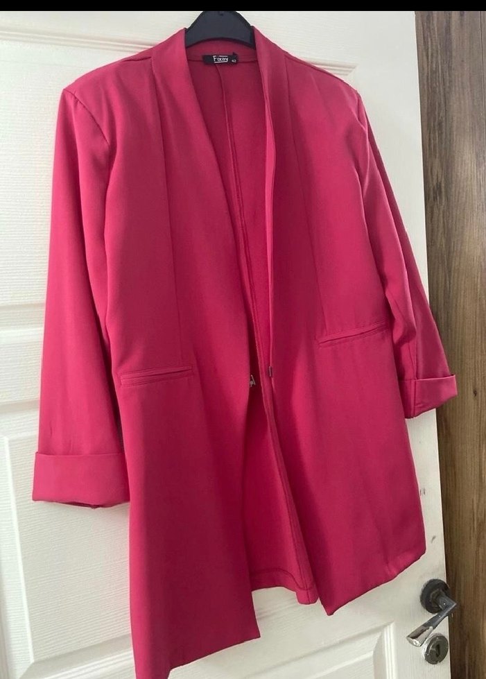 Pembe, uzun kollu ve yakalı bu kadın kabanı, drapeli tasarımıyla iş ortamına uygundur. Parlak kumaşı ve regular kesimi dikkat çeker.