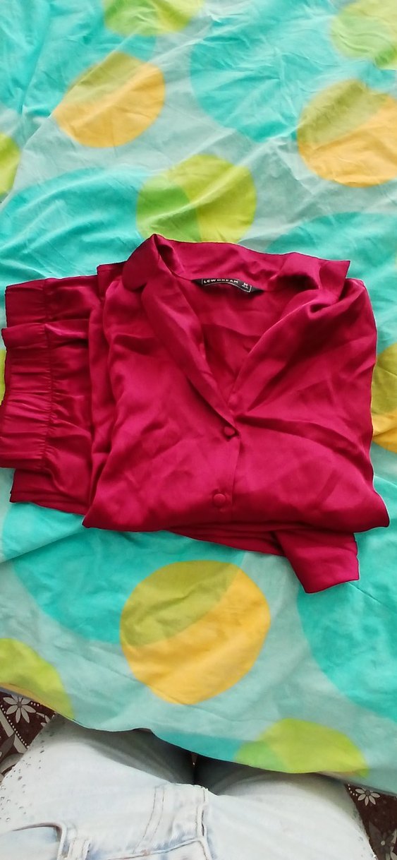 Renkli pembe, uzun kollu ve bol kesim kadın pijama takımı. Minimalist ve pop kültür tarzında, yumuşak dokulu kumaştan.