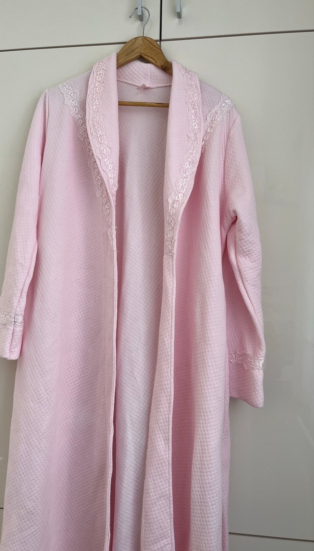 Uzun kollu, pembe renkli, rahat kesimli kadın sabahlık. Yumuşak dokusu ve dantel detaylarıyla konfor sağlar.