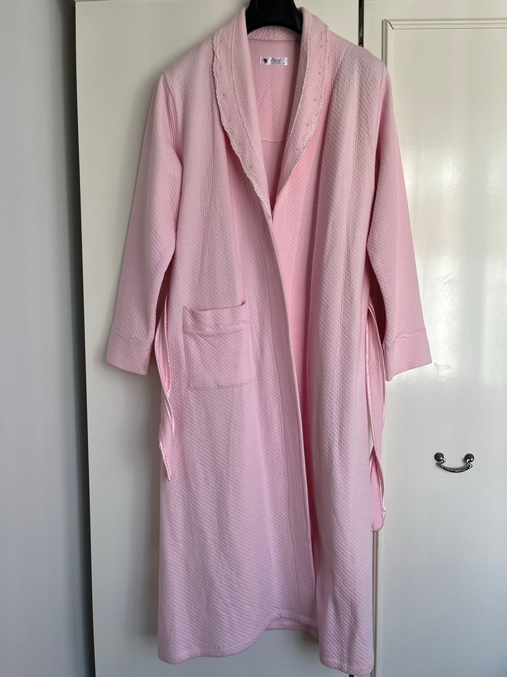 Pastel pembe yumuşacık pamuklu sabahlık, rahat kesim ve normcore tarzında. Cepli ve şal yaka detayıyla konforlu kullanım sağlar. Hiç kullanılmadı fakat arka kısmında ve kolunda bilmediğim küçük lekeler mevcut fotoğrafta ekledim.