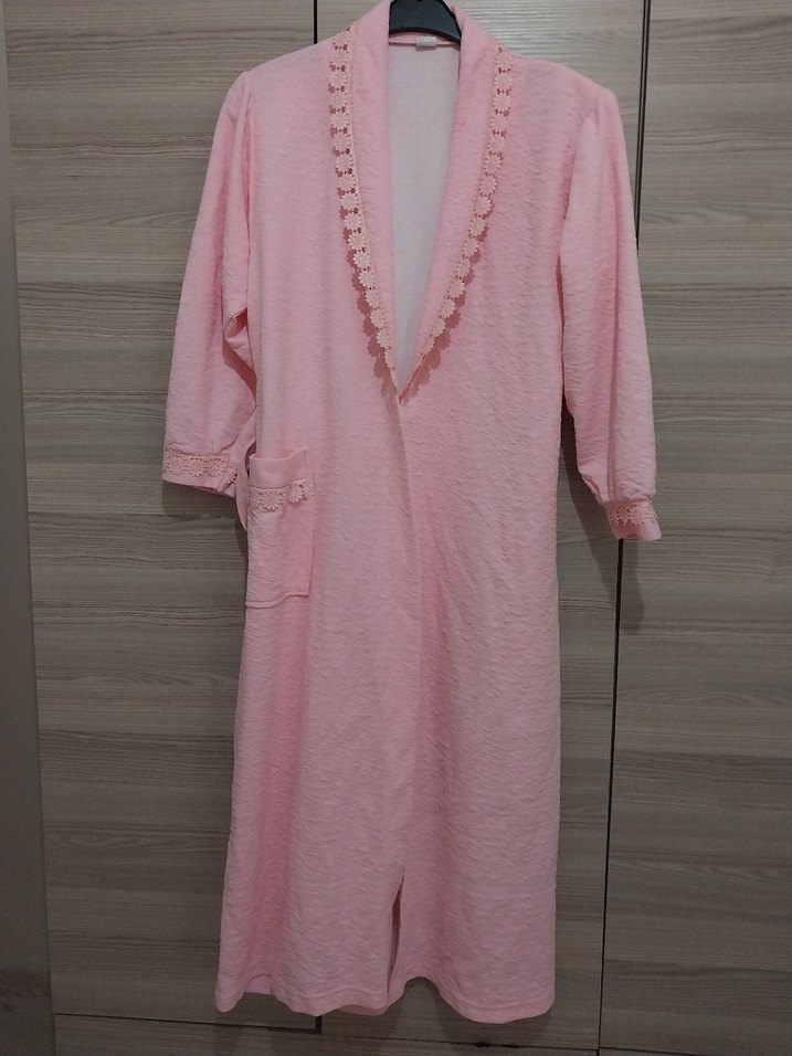 Sepete ekleyerek toplu alım yapmayın.Ürünleri birleştirip ayrı albüm açıyorum.Uzun kollu, bol kesim pembe sabahlık, yumuşak kumaştan. Pastel tonlu, dantel detaylı sade ve rahat tasarım.Sadece doğum sonrası hastane çıkışında kullanıldı.iç geceliğini kullandım..Kolunun ucunda göze batmayan sarılık var.30 yıllık.Beden etiketi yoktur onun için verdiğim ölçüleri dikkate alarak alım yapın lütfen.