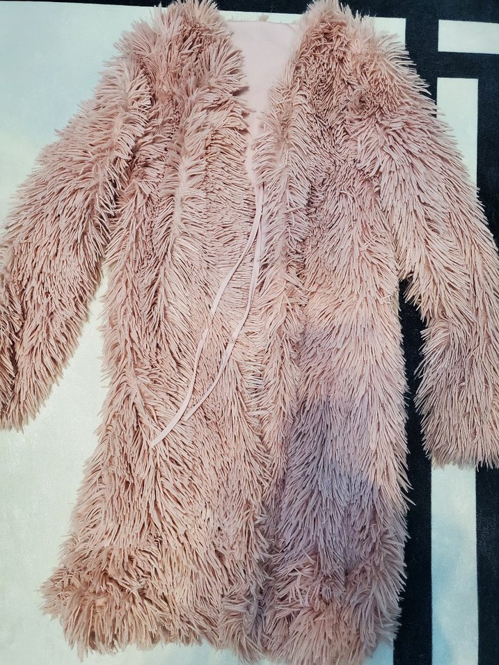Pembe pastel renkte, uzun kollu ve uzun kesim, suni kürk detaylı, bohem tarzda kadın ceketi.