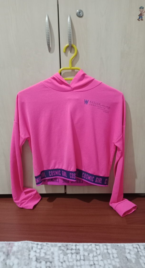 Pembe renkli, uzun kollu, bisiklet yaka ve fitted kesime sahip kadın sweatshirtü. Alt kısmında elastik ve renkli baskılar bulunur. Spor ve günlük kullanıma uygundur.