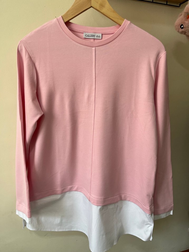 Pamuk kumaştan yapılmış, uzun kollu ve yuvarlak yakalı pembe renkli, bol kesim kadın sweatshirtü. Beyaz katmanlı etek ucu, gündelik şıklık sağlar.