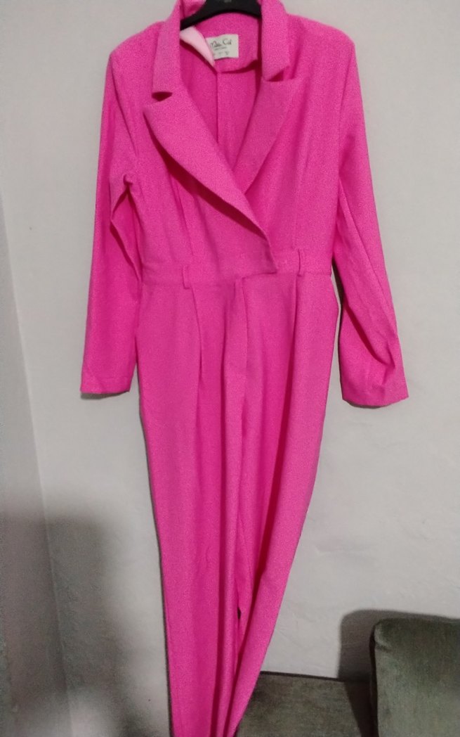 Pembe uzun kollu kadın tulum, notched lapel yaka ve düğme detaylarına sahip. Sentetik kumaştan, regular fit ve minimalist tarzda, ofis kullanımı için uygundur.