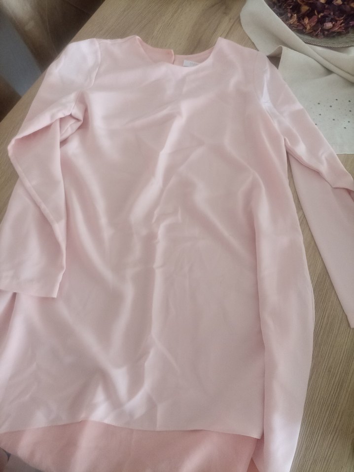 Pastel pembe renkli, uzun kollu, bol kesim, drapeli kadın tunik. Yuvarlak yakalı, ipeksi dokulu ve minimal tarzda bir modeldir.