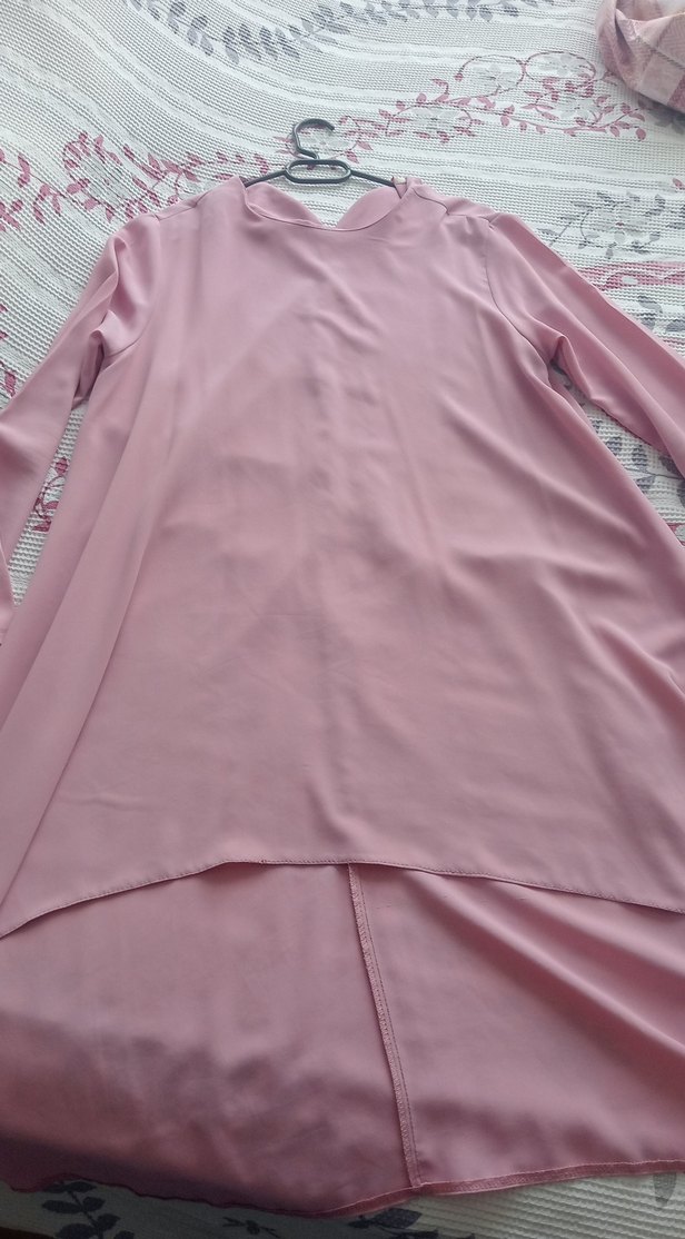 dökümlü detaya sahip, pembe uzun kollu bol kesim tunik. Yumuşak sentetik kumaştan, günlük kullanım için uygun. ön kısa arka uzun ön diz üstü arka bilekte temiz ürün