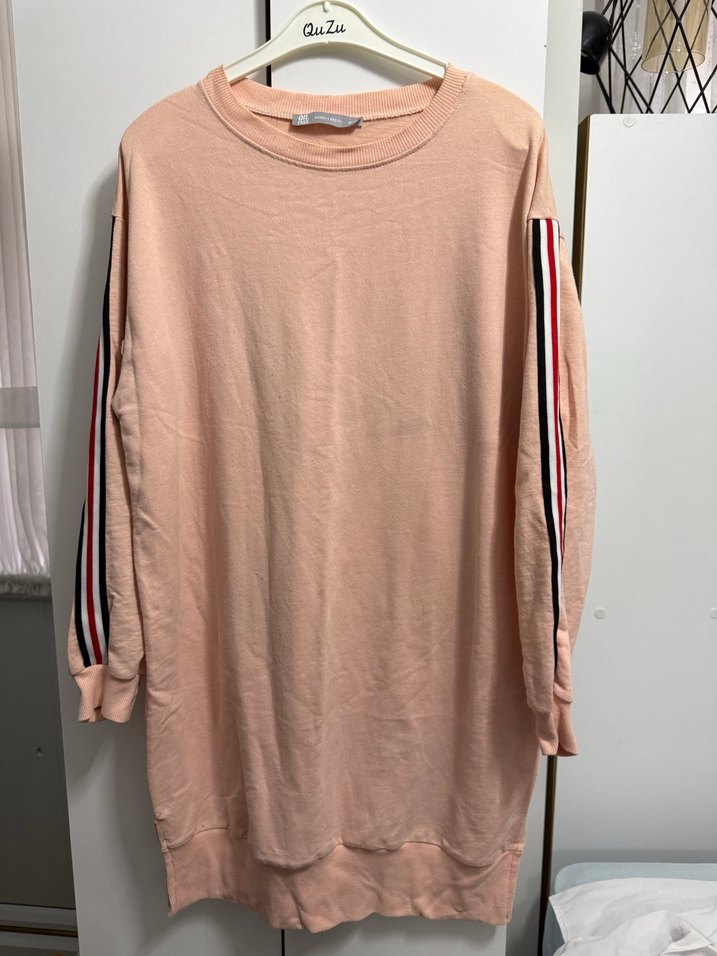Pastel pembe renkte, uzun kollu, yuvarlak yakalı ve bol kesim kadın tunik. Kollarında şerit detayları bulunur ve günlük kullanıma uygun rahat bir şıklık sunar. Kumaşı yumuşak ve konforludur.