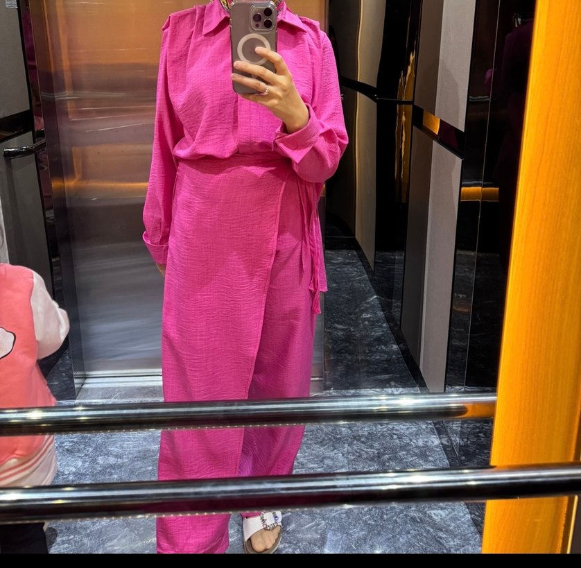 Pembe, parlak renkte, uzun kollu ve uzun kesime sahip, regular fit kadın elbisesi. Düz desensiz, iş stili için uygun.