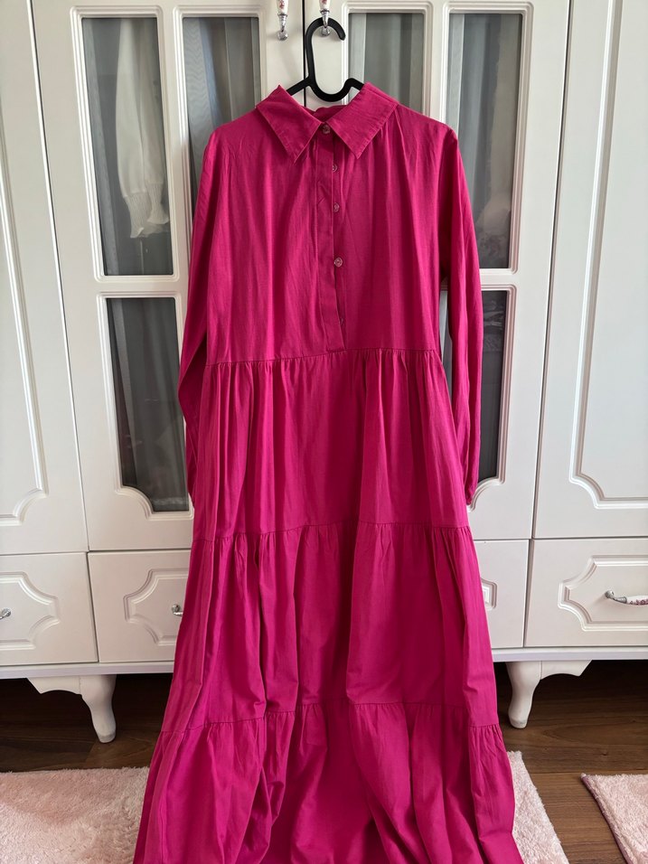 Koyu pembe keten kumaştan, uzun kollu ve yakalı, pileli detaylı bol kesim uzun elbise. Bohem tarzıyla günlük kullanıma uygundur.