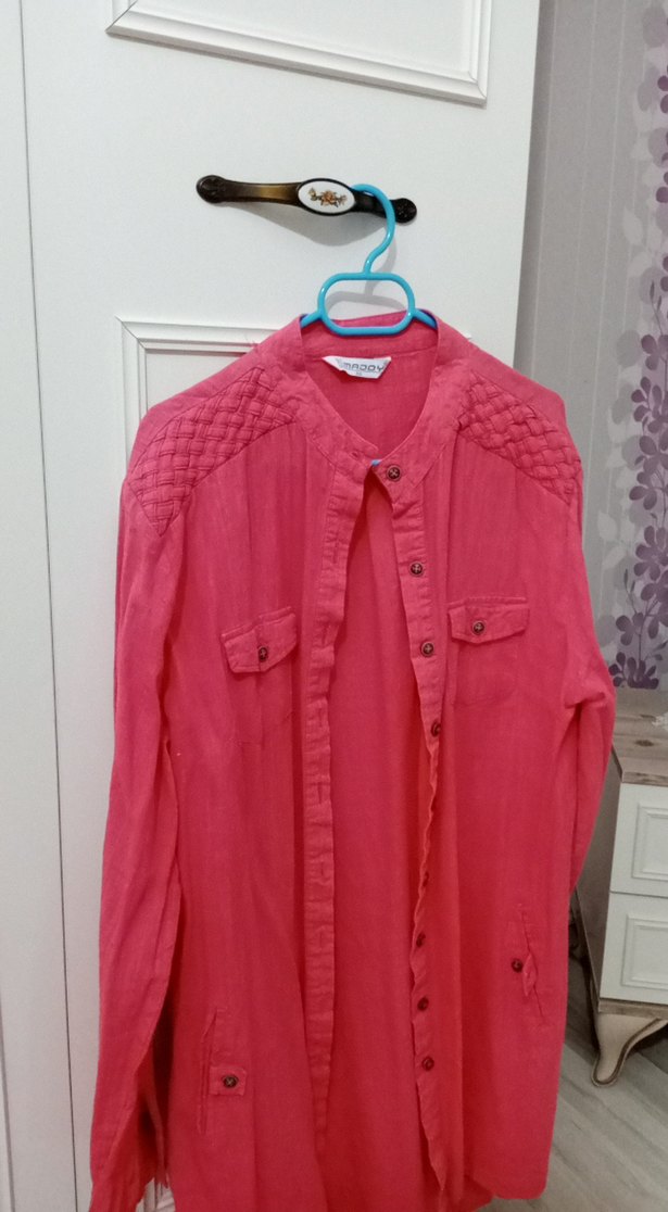 Pembe keten gömlek, uzun kollu, yakalı ve düğmeli detaylara sahip. Salaş kesimi ve midi boyu ile günlük kullanıma uygundur.