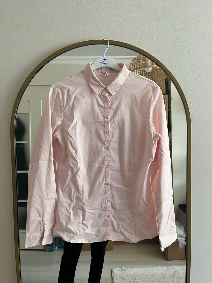 Pembe keten gömlek, uzun kollu ve yakalı, düğmeli, rahat kesim. Günlük kullanım için uygundur.