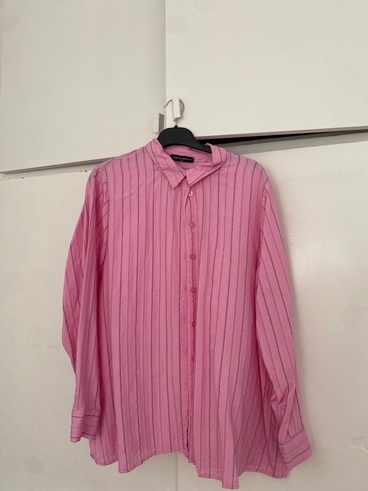 Pembe keten gömlek, uzun kollu ve düğmeli ön tasarıma sahiptir. Salaş kesimi ve yakalı boyun stili ile rahat bir şıklık sunar.