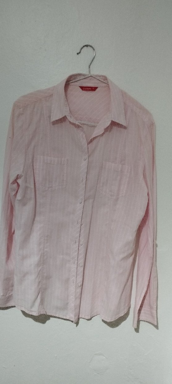 Pastel pembe renkte, uzun kollu, düğmeli ve yakalı keten gömlek. Rahat kesimi ve normal boyuyla günlük kullanıma uygundur.