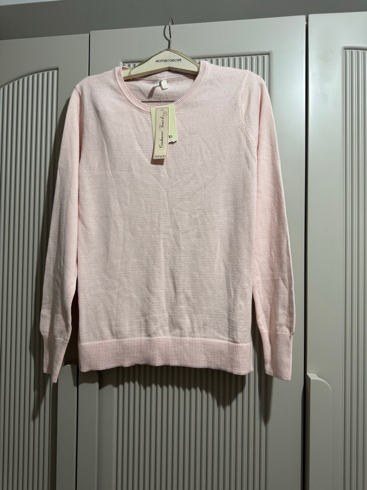 Uzun kollu, bisiklet yaka ve bol kesim pembe keten kadın kazak. Yumuşak kumaşıyla gündelik kullanıma uygun rahat ve sade stil sunar.