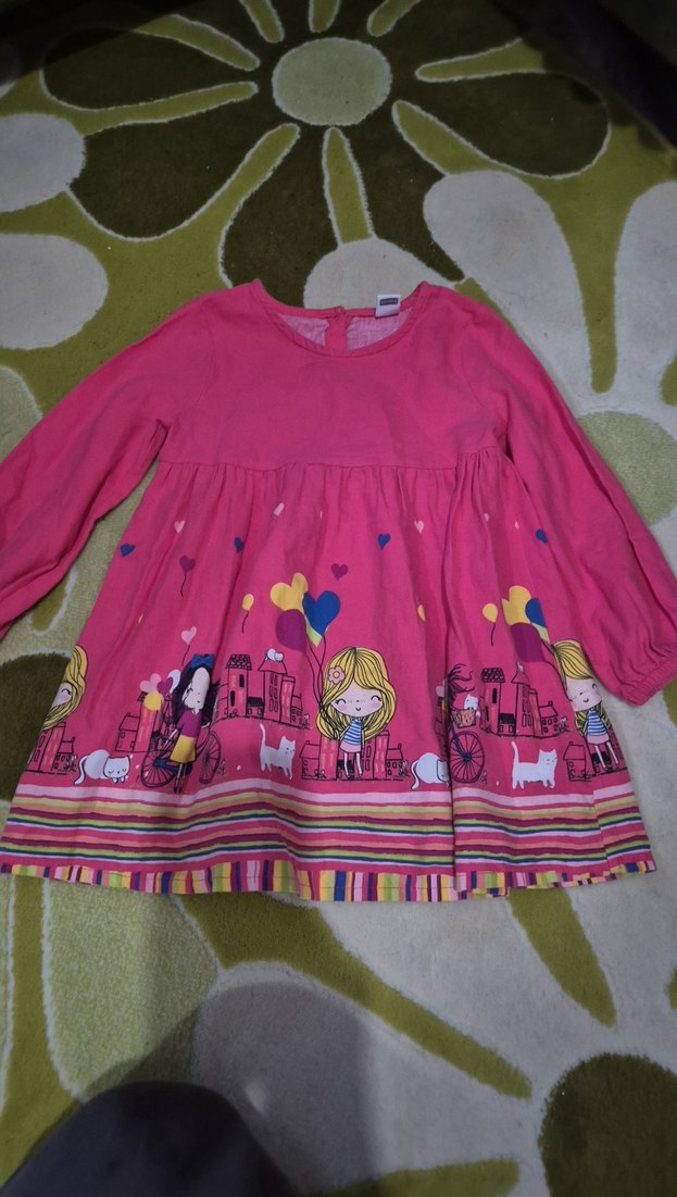 Pamuklu, uzun kollu, bol kesim, renkli baskılı ve fırfırlı pembe kız çocuk elbisesi. Yuvarlak yakalı ve normcore tarzında.