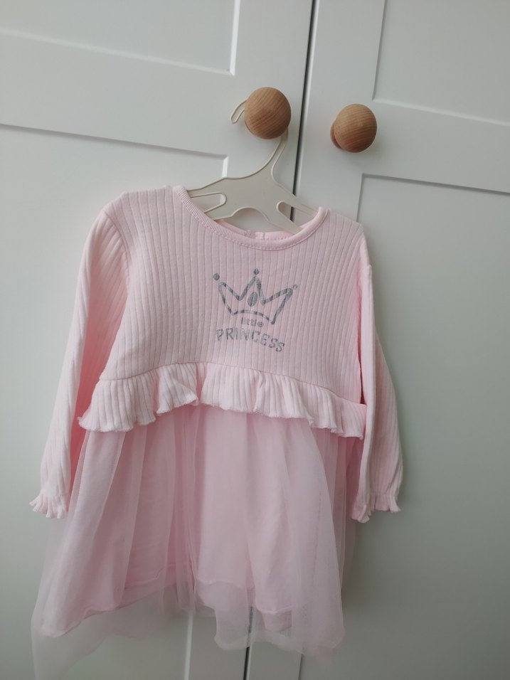 Pembe renkli, uzun kollu, yuvarlak yakalı kız çocuk elbisesi; önünde fırfır detayı ve baskılı taç deseni bulunur. 1 kere giyildi.