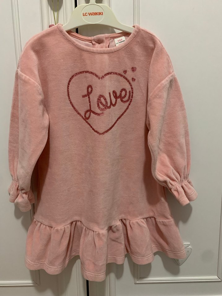 Pembe renkli, uzun kollu, yumuşak ve sıcak kadife kumaştan kız çocuk elbisesi. Önde 'Love' yazısı baskılı, etek kısmında fırfır detaylı, rahat kesim.