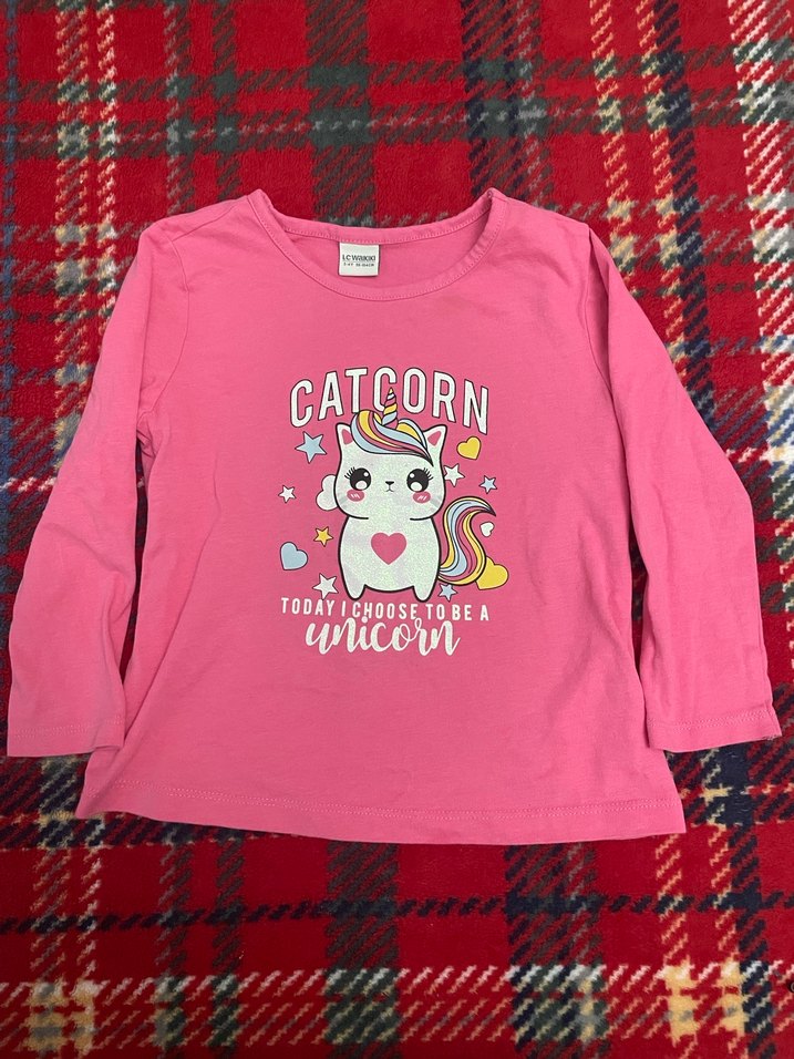 Pembe, pamuklu, uzun kollu kız çocuk tişörtü. Renkli baskılı kedi-unicorn deseni ve payet detayları bulunur. Yuvarlak yakalı, normcore tarzda.