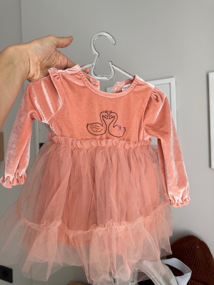Pembe, uzun kollu, fırfırlı ve nakışlı kuğu desenli, yumuşak ve sıcak dokulu kumaştan yapılmış, kruvaze yakalı, kat kat tül etekli dar kesim kız elbisesi. 1 gün giyildi