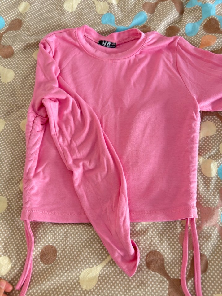 Pembe renkli, uzun kollu, dar kesim kız tişörtü. Yuvarlak yaka ve yumuşak sentetik kumaştan, pastel tonlarda sade şık sokak stili.