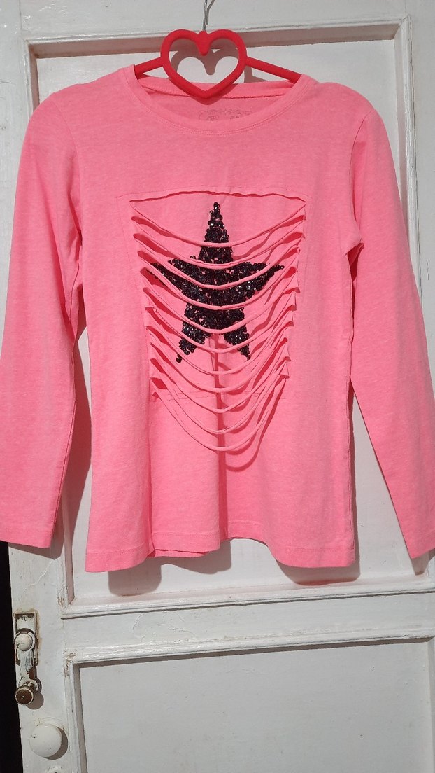 Pembe renkli, yırtmaç detaylı uzun kollu kız tişörtü. Salaş kesim, yuvarlak yaka ve renkli baskı ile sokak stiline uygun. Mesaj atarak alınız.