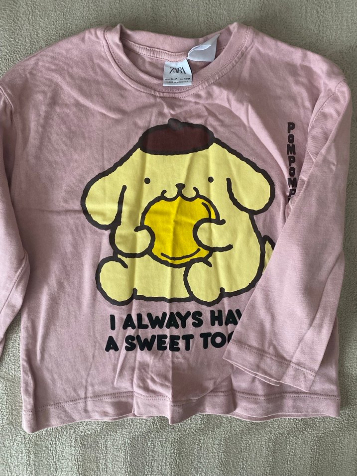 Pembe uzun kollu kız tişörtü, bol kesim ve bisiklet yaka. Kurabiye tutan sevimli karakter baskılı, "I ALWAYS HAVE A SWEET TOOTH" yazılı. Yumuşak ve sıcak kumaş, düğme detaylı.