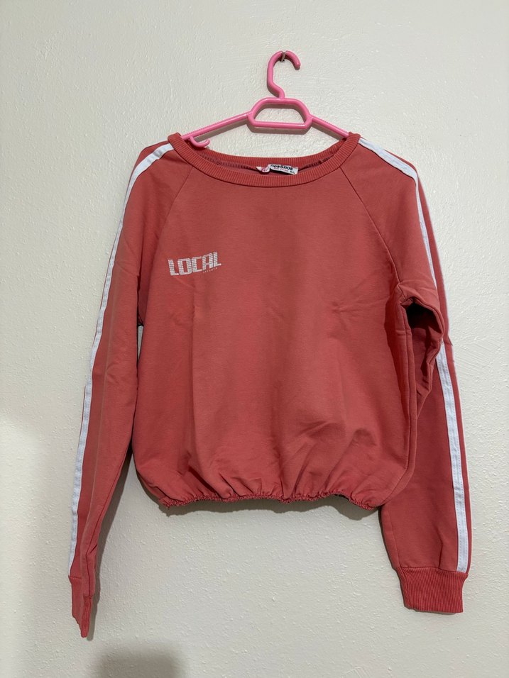 Pembe, uzun kollu, yuvarlak yakalı, rahat kesim sweatshirt. Kollarında beyaz şeritler ve göğüste LOCAL yazısı bulunur. Yumuşak ve sıcak kumaştan üretilmiştir.