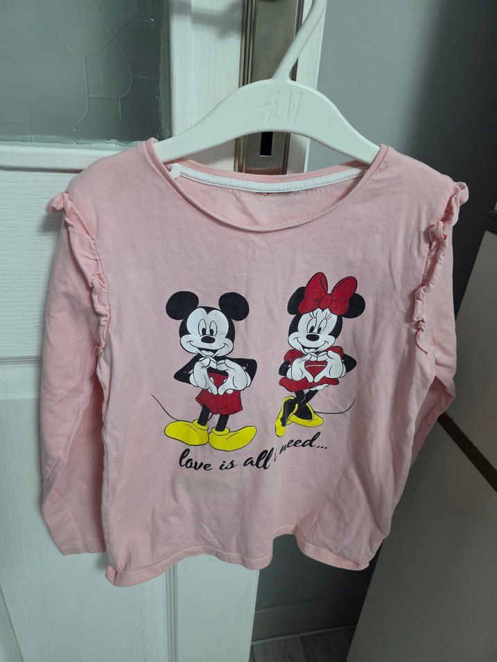 Pamuklu, pastel pembe, uzun kollu ve bol kesim kız tişörtü. Fırfır detaylı kollar ve Mickey ile Minnie baskısı vardır. Rahat ve şık bir sokak stili parçası. 7-8 yaş için uygundur.